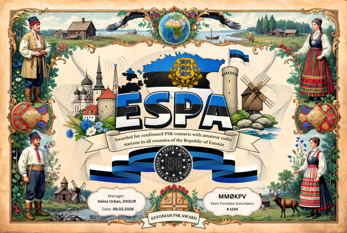 The Estonian PSK Award Series (ESPA) was devised by the European PSK Club (EPC) on 11 March 2026. The award is sponsored to promote activity on PSK digital modes in Estonia.