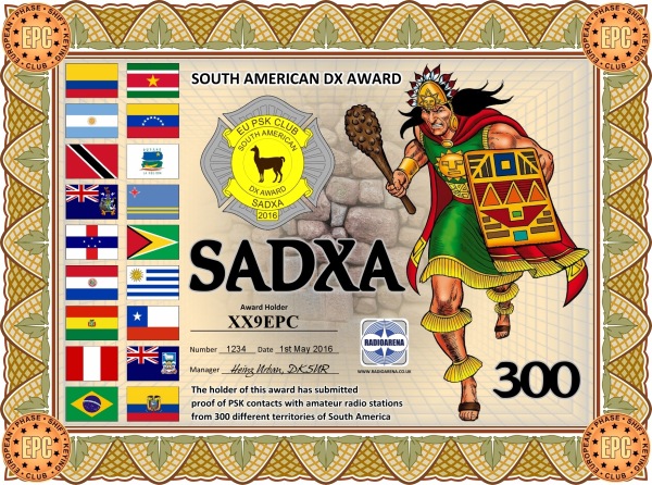 The South American DX PSK Award Series (SADXA) is dedicated to the 10th Anniversary of the European PSK Club. It has been sponsored by Radioarena UK Ltd and devised by the European PSK Club on 5th June, 2016 for two-way PSK contacts with amateur radio stations from different territories of South America listed below.
