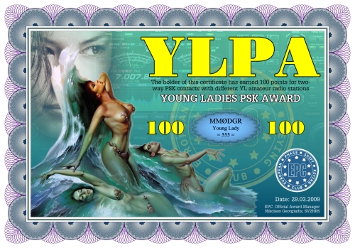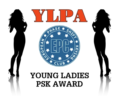The Young Ladies PSK Award Series (YLPA) was devised by the European PSK Club on 22nd May 2008. This was to sponsor a series of PSK awards for contacts with YL stations. Any award in this series may be claimed by any licensed radio amateur, club station or DMS/SWL eligible under the EPC Awards General Rules who can produce evidence of having contacted or monitored ladies on PSK modes. Credit will be given for contacts made on any of the amateur bands below 30 MHz. Contacts count on or after 10th June 2006.