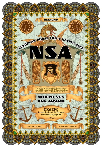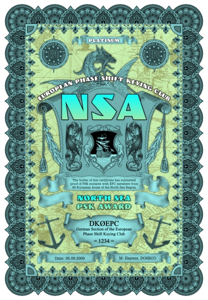 NSA Bronze, NSA Silver, NSA Gold, NSA Platinum, and NSA Diamond Awards may be claimed by any licensed radio amateur, club station or DMS/SWL eligible under EPC Awards General Rules who can produce evidence in a form of ADIF log of having contacted/monitored EPC members from 30, 40, 50, 60, and 70 EU Areas of the North Sea Region respectively at the time of application on BPSK31, BPSK63, BPSK125, QPSK31, QPSK63, and/or QPSK125 modes. Credit will be given for contacts made on any of the amateur bands below 30 MHz. Each EU Area counts only once. Contacts are valid on or after 10th June 2006.