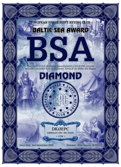 BSA Bronze, BSA Silver, BSA Gold, BSA Platinum, and BSA Diamond Awards may be claimed by any licensed radio amateur, club station or DMS/SWL eligible under EPC Awards General Rules who can produce evidence in a form of ADIF log of having contacted/monitored EPC members from 20, 30, 40, 50, and 60 EU Areas of the Baltic Sea Region respectively at the time of application on BPSK31, BPSK63, BPSK125, QPSK31, QPSK63, and/or QPSK125 modes. Credit will be given for contacts made on any of the amateur bands below 30 MHz. Each EU Area counts only once. Contacts are valid on or after 10th June 2006.